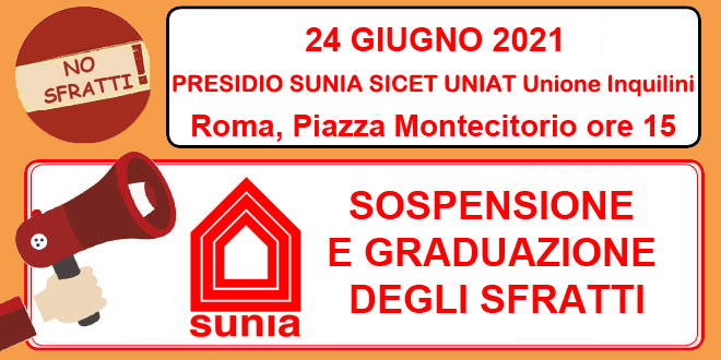 Roma, 25 Giugno 2021 Si è svolto ieri pomeriggio a Piazza Montecitorio un nuovo presidio dei sindacati degli inquilini a sostegno delle oltre 80.000 famiglie sottoposte a sfratto e per le quali non è ormai prevista nessuna forma di proroga dell’esecuzione. Nonostante la gravissima carenza di case popolari ed un mercato dell’affitto privato in cui [...]