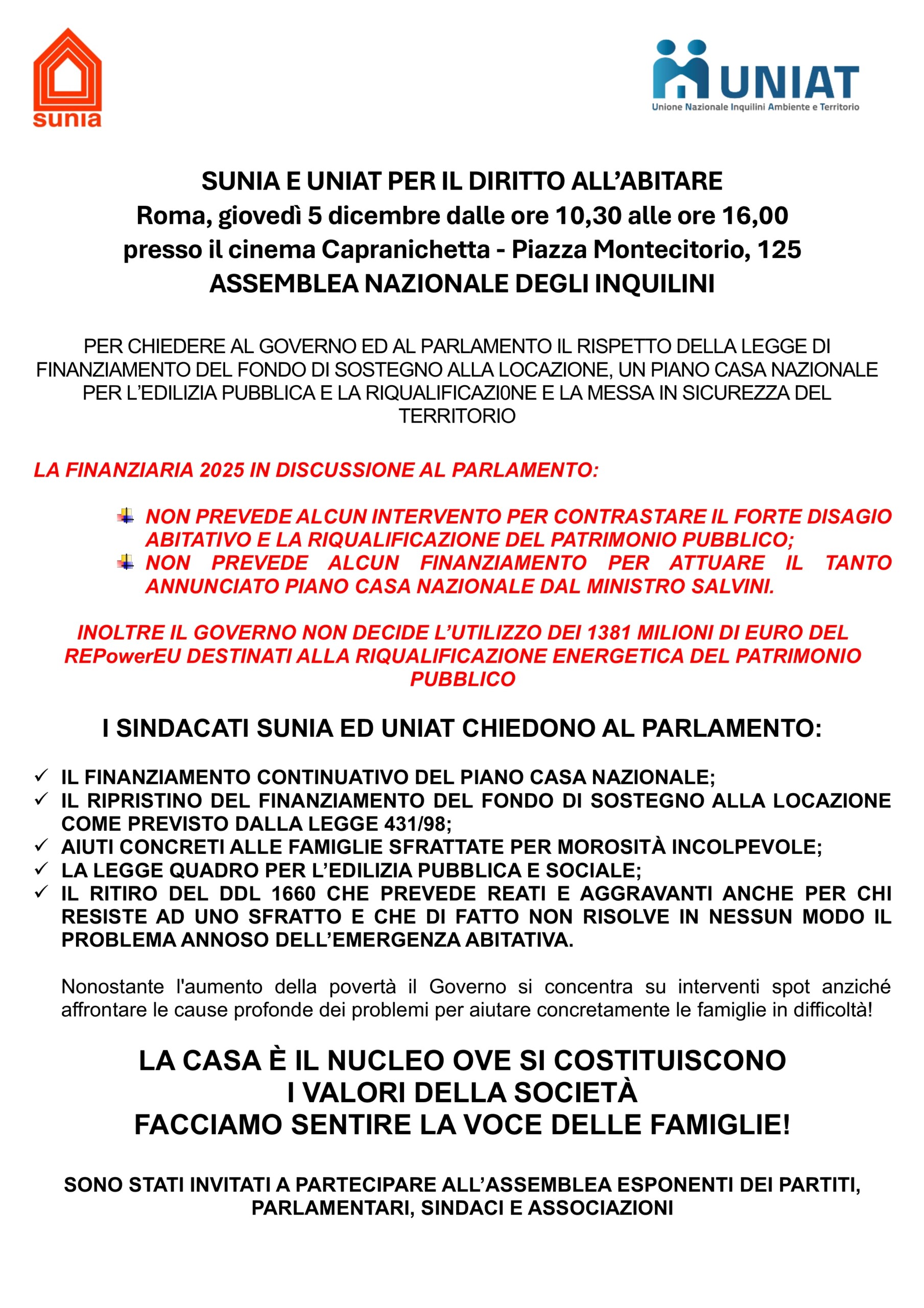 Roma, 5 dicembre 2024 Al Cinema Capranichetta ore 10,30 SUNIA e UNIAT, Sindacati degli inquilini, sono fortemente preoccupati per la crescente emergenza abitativa nel nostro Paese e convocano un’assemblea nazionale sul diritto all’abitare. SUNIA e UNIAT ribadiscono che anche quest’anno la Legge di Bilancio 2025, presentata dal Governo, non stanzia alcuna risorsa per contrastare [...]