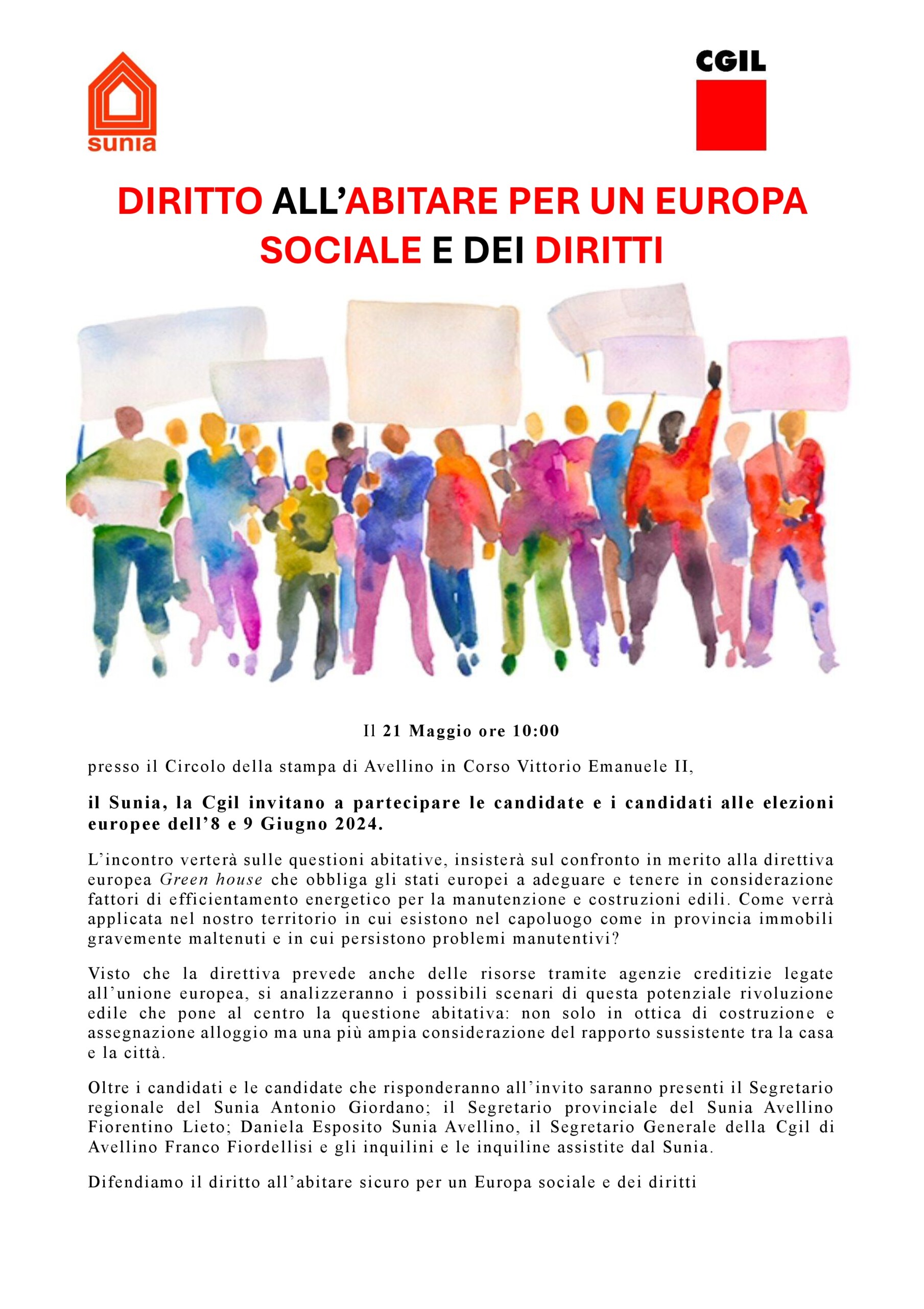 Avellino. Il 21 Maggio alle ore 10 presso il Circolo della stampa di Avellino in Corso Vittorio Emanuele II, il SUNIA e la Cgil invitano le candidate e i candidati alle elezioni europee dell’8 e 9 Giugno 2024 a partecipare all’incontro che verterà su questioni abitative
